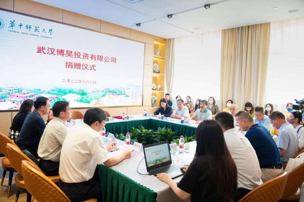 武汉博昊投资有限公司董事长助理余卓丞、武汉云稼景筑设计工程有限公司董事长张岩、人民网湖北频道总编辑荣先明、湖北博昊济学基金会理事长助理谭琪以及学校党委宣传部、教育发展基金会、政治与国际关系学院等相关单位负责人及师生代表参加捐赠仪式。