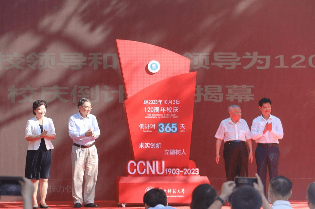 华大在线讯(记者 华轩)南湖浪涌,桂香灵动,金风和畅,华大葱茏。一百一十九载,弦歌不辍;一百一十九载,春华秋实。10月2日,全体校领导、各单位主要负责人、校友代表、离退休教师代表、教师代表、学生代表齐聚文华公书林,共同庆祝学校119周年华诞,共同见证120周年校庆倒计时一周年启动仪式。校党委书记赵凌云、校长郝芳华,原校领导王庆生、马敏共同为倒计时牌揭幕。启动仪式以线上线下相结合的方式举行,校党委副书记查道林主持。