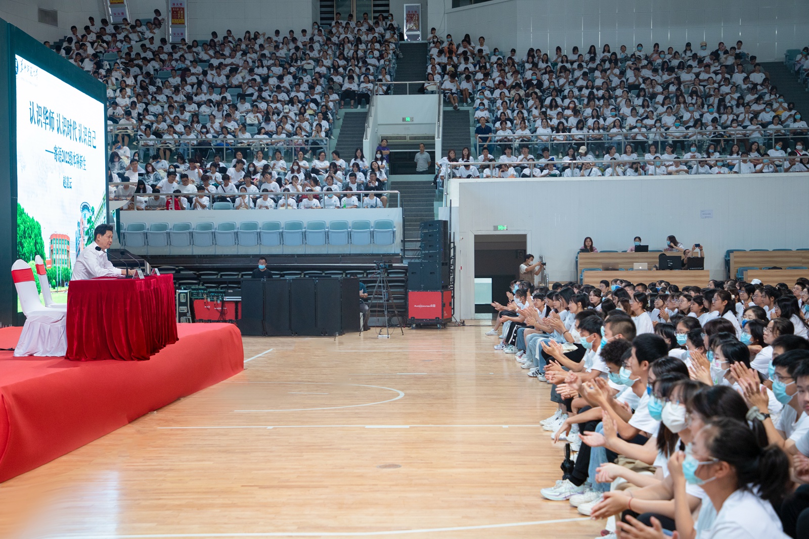 华大在线讯(记者 毛军刚)“我是谁?我在哪里?我该往何处去?这是同学们所面临的大学之问、时代之问、人生之问,也是我作为老学长今天同大家谈心的话题……”9月25日,校党委书记赵凌云面向2022级全体新生,采取线下讲授、线上直播相结合的方式,在佑铭体育馆开讲第一堂思想政治理论课。开学第一课由校党委副书记陈迪明主持。
