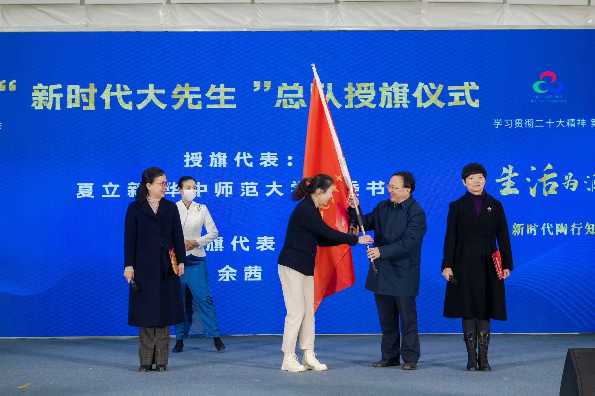 夏立新为“新时代大先生”总队代表——全国教书育人楷模马丹,荆楚好老师代表、武汉市育才小学余茜老师,荆楚好老师代表、华体会官方版网站登录入口心理学院田媛教授授旗