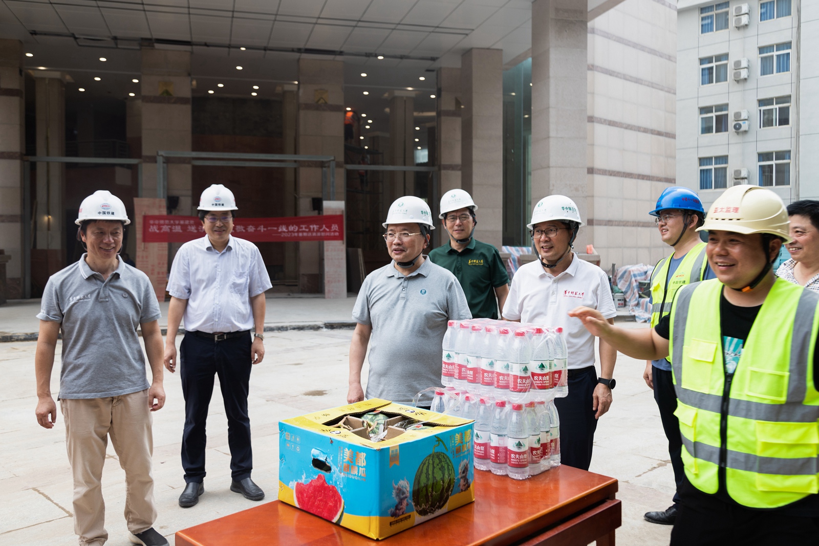夏立新向坚守一线的工作人员一一表示慰问,并强调,各工地在高温天气下要强化校园安全意识,确保工程质量和工程进度,为新学期各项工作的顺利开展做好准备,为即将到来的120周年校庆展现校园新貌。