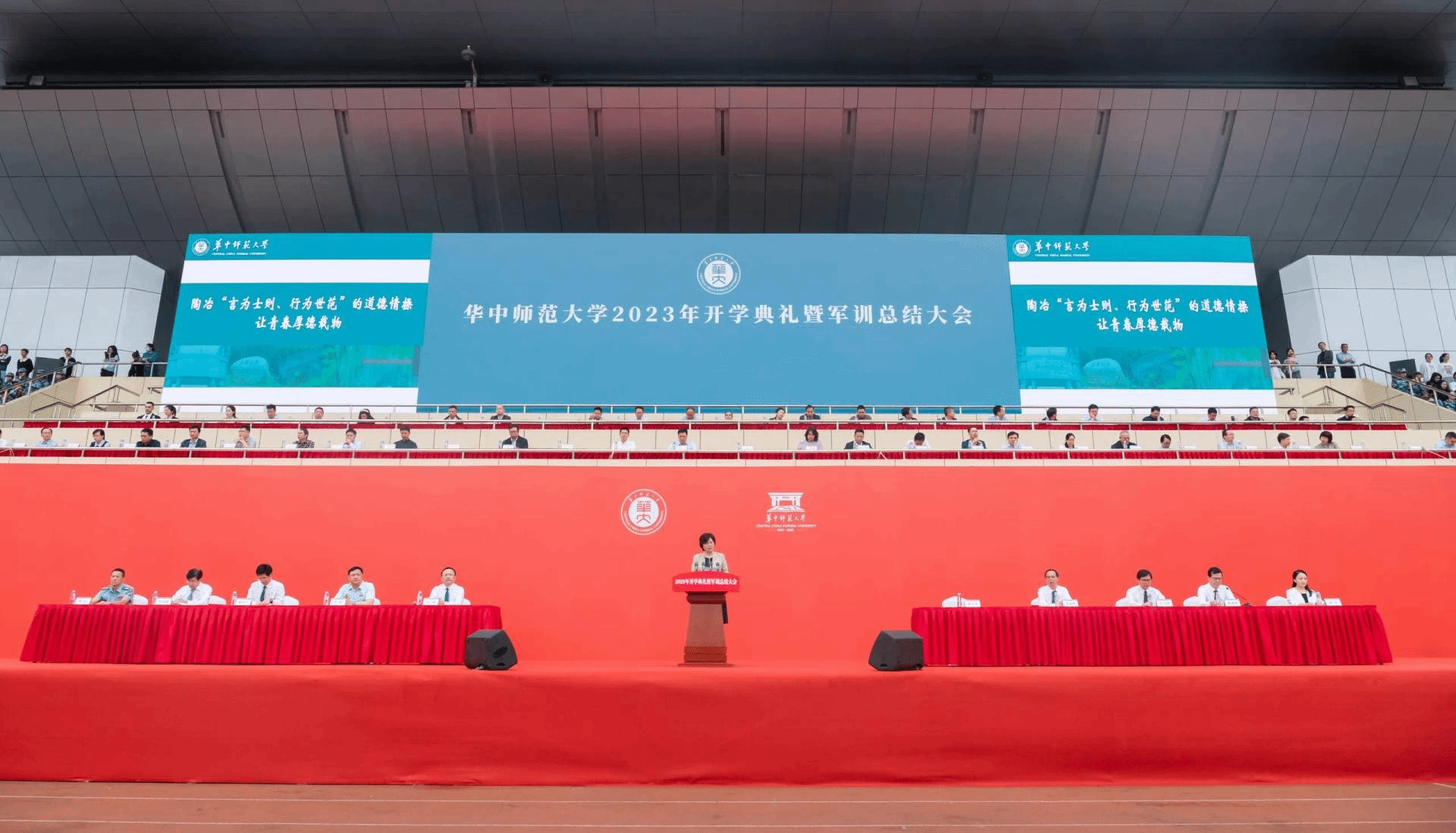 雄浑的军歌声声入耳,澎湃的心潮阵阵涌动,2023级本科新生军训总结汇报拉开帷幕。校党委书记夏立新在军训团团长的陪同下对各学院方阵进行检阅。“为学校争光”“为人民服务”的呐喊响遏行云,各方阵队列以容光焕发的精神面貌献礼百廿华大。