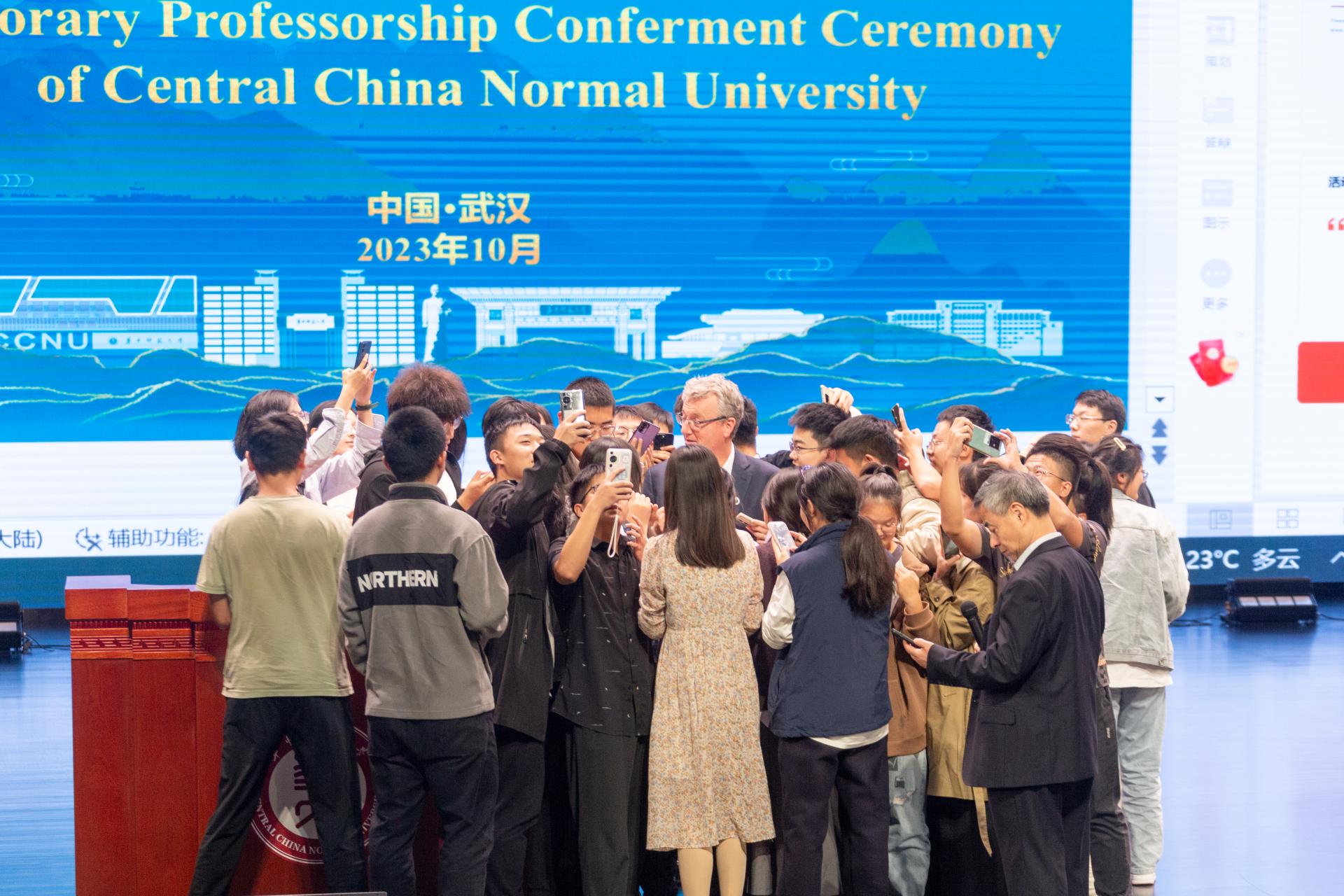 报告结束后,同学们纷纷自发上台与戴维·麦克米伦教授交流、拍照。戴维·麦克米伦教授非常感谢同学们的热情,并向现场观众展示了诺贝尔奖章。最后,在大家热情的邀请下,戴维·麦克米伦教授与现场全体师生合影。同学们表示,有机会接触到享誉世界的杰出科学家,聆听学术见解,感受科学精神和创新思维,对进一步培养对科学的兴趣、激发探索科学的热情有着极其重要的意义。