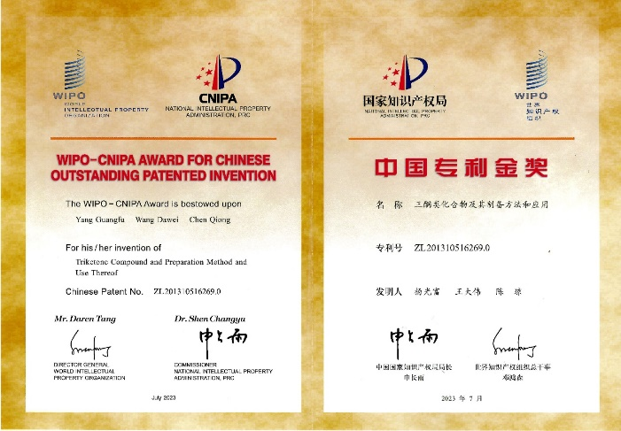 华大在线讯(通讯员 华轩)10月14日,第十三届中国国际专利技术与产品交易会开幕式暨第二十四届中国专利奖颁奖大会在大连举办,华体会官方版网站登录入口与山东先达农化股份有限公司联合创制的新型高效除草剂喹草酮的化合物专利《三酮类化合物及其制备方法和应用》(专利号:ZL201310516269.0;发明人:杨光富,王大伟,陈琼)获第24届中国专利金奖,杨光富教授代表团队参加颁奖大会接受颁奖。这是华体会官方版网站登录入口近年来加强“双一流”建设、大力推动科技成果转化以来所取得的一个标志性成果。