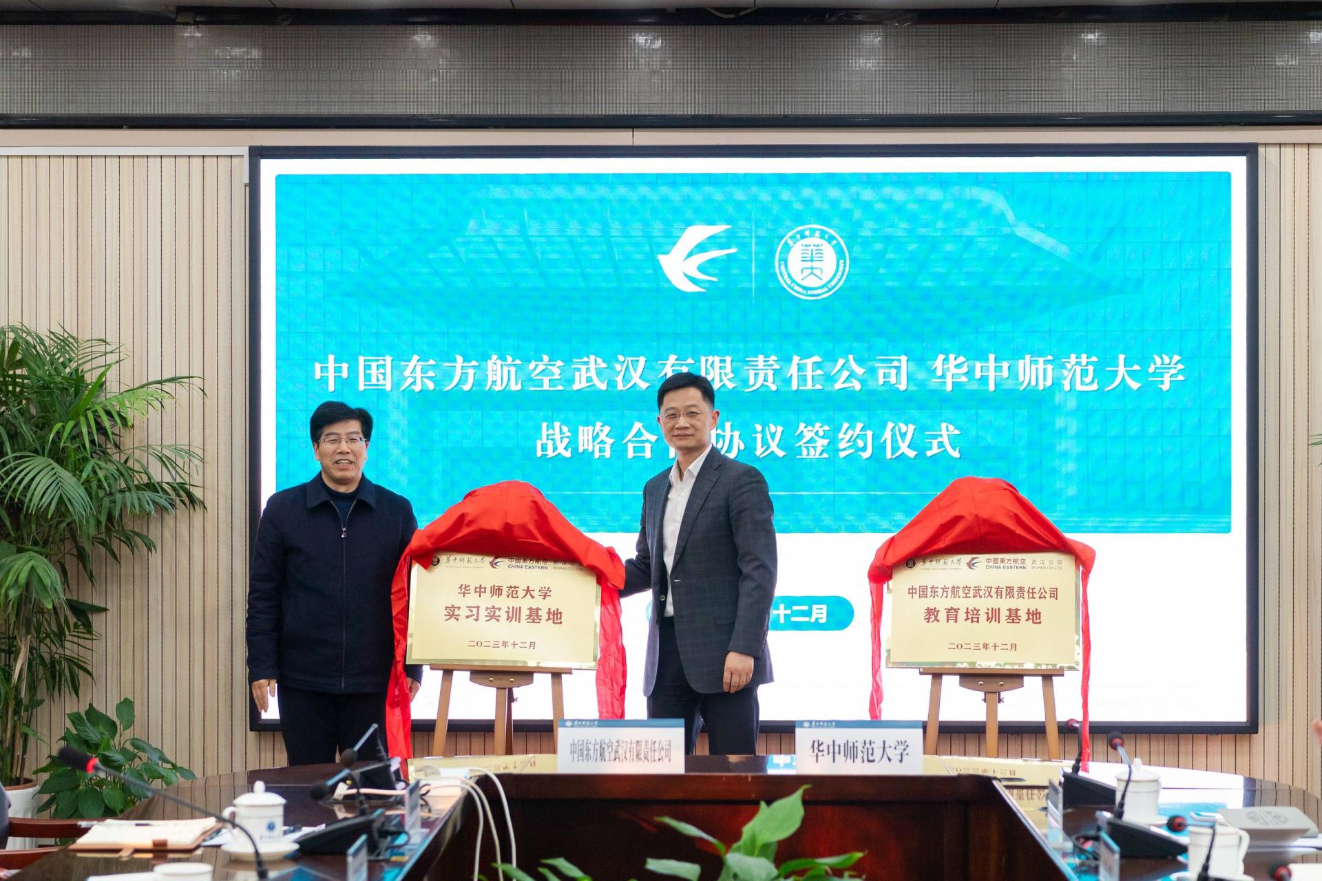 李良斌与彭双阶代表双方单位为中国东方航空武汉有限责任公司教育培训基地、华体会官方版网站登录入口实习实训基地揭牌。