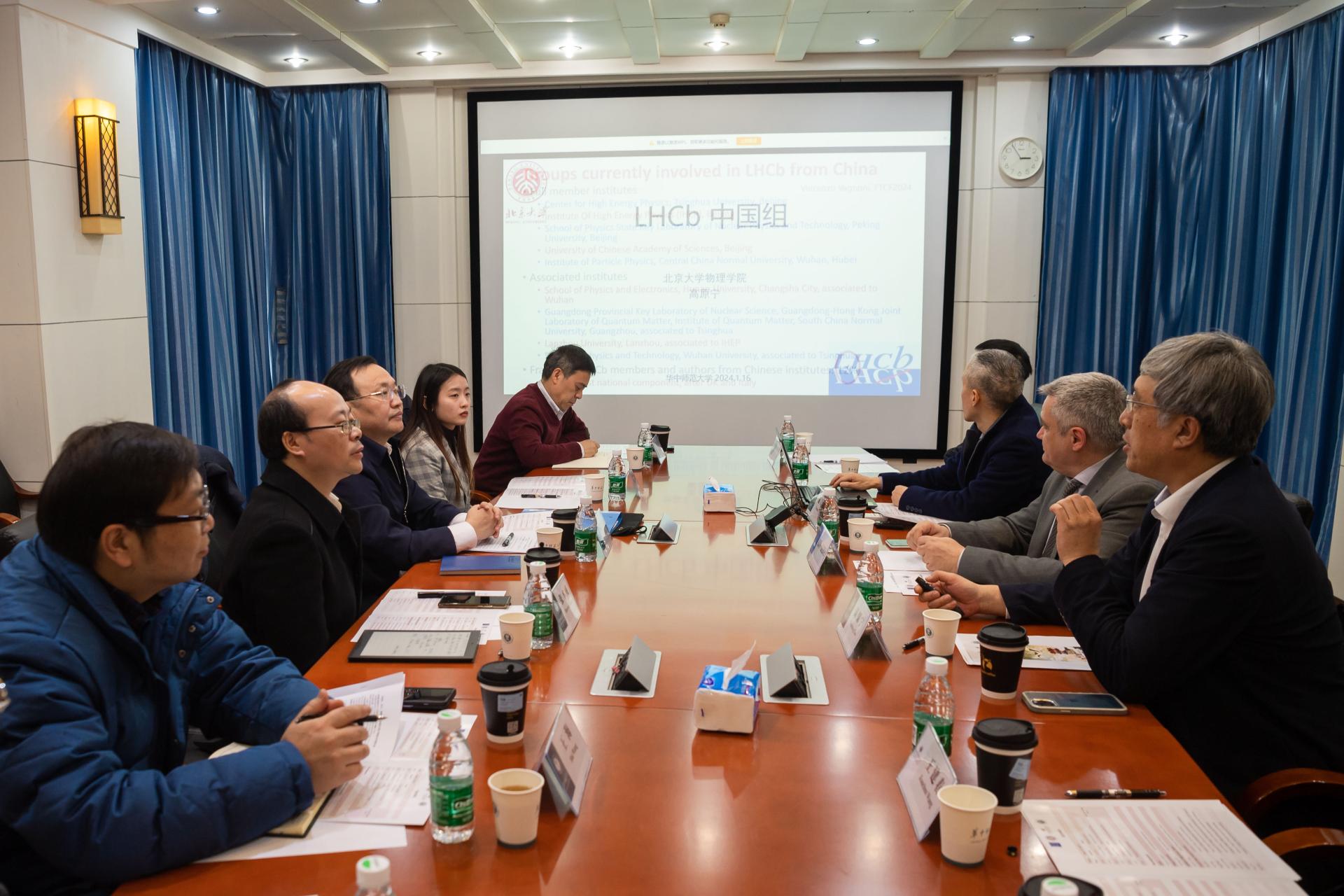 华大在线讯(通讯员 尹航)1月16日,欧洲核子研究中心—北京大学—中国科学院高能物理研究所—华体会官方版网站登录入口粒子物理合作会谈在校举行。欧洲核子研究中心(CERN)LHCb国际实验组发言人文森佐.瓦尼奥尼博士、北京大学物理学院院长高原宁院士、校党委书记夏立新、中国科学院高能物理研究所实验中心副主任王建春研究员出席。科技处、国际合作与交流处、物理科学与技术学院负责人和粒子物理研究所相关人员参加会谈。