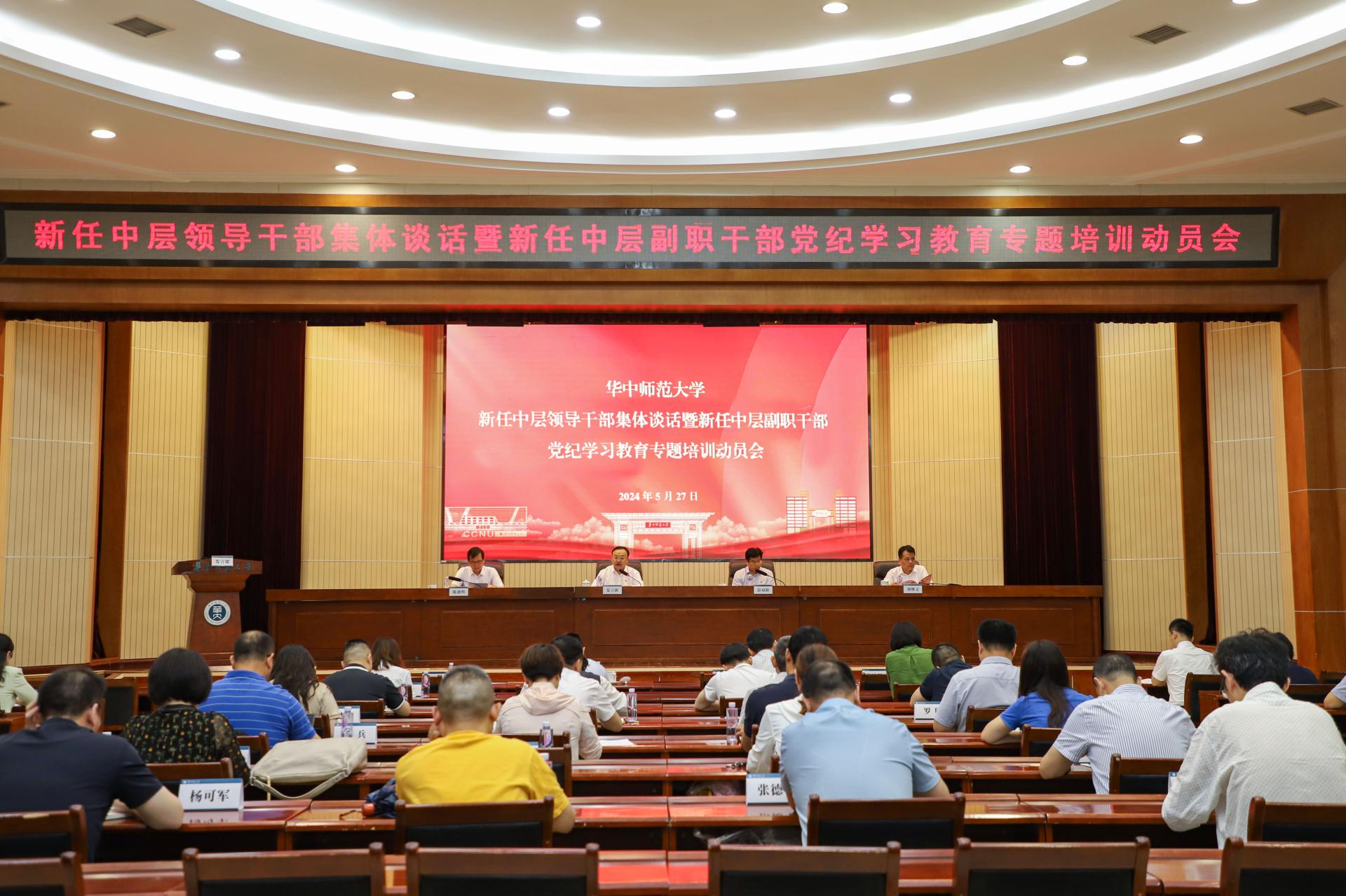 华大在线讯(通讯员 张栩晨)5月27日,学校新任中层领导干部集体谈话暨新任中层副职干部党纪学习教育专题培训动员会在科学会堂一楼报告厅举行。校党委书记夏立新,校长彭双阶,校党委副书记陈迪明,校党委副书记、纪委书记刘继文出席并讲话,相关单位新提任中层干部参会。会议由陈迪明主持。