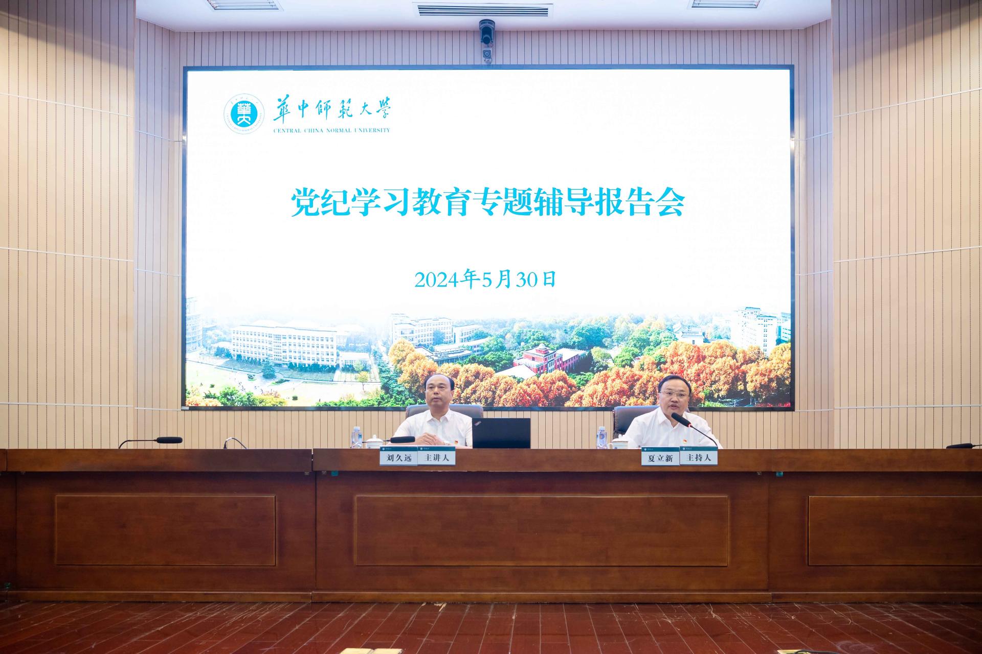 华大在线讯(通讯员 王涛)为深入学习贯彻《中国共产党纪律处分条例》(以下简称《条例》),进一步加强全校党员干部的党性教育和纪律建设,推动党纪学习教育走深走实,5月30日,学校党委举行党纪学习教育专题辅导报告会,师生党员“同上一堂党纪课”。湖北省监察委员会委员刘久远应邀作专题辅导报告。校党委书记夏立新主持报告会。