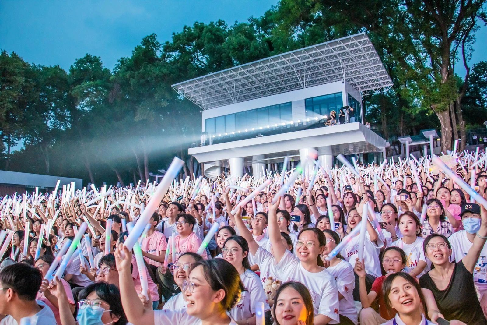 伴随着《星河云端》舒缓悠扬的旋律,观众邂逅《向云端》的美好,顶着濛濛细雨,全场自发合唱毕业组歌。《追光者》与《入海》以温婉的旋律陪伴毕业生们重温了青涩的校园时光;由辅导员加入演唱的《再见》将全场情绪推向最高潮。