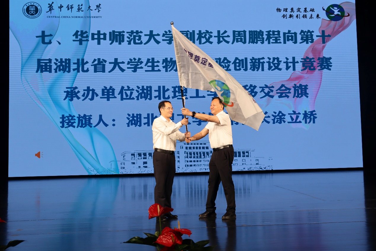 周鹏程向第十届湖北省大学生物理实验创新设计竞赛承办单位湖北理工学院移交会旗