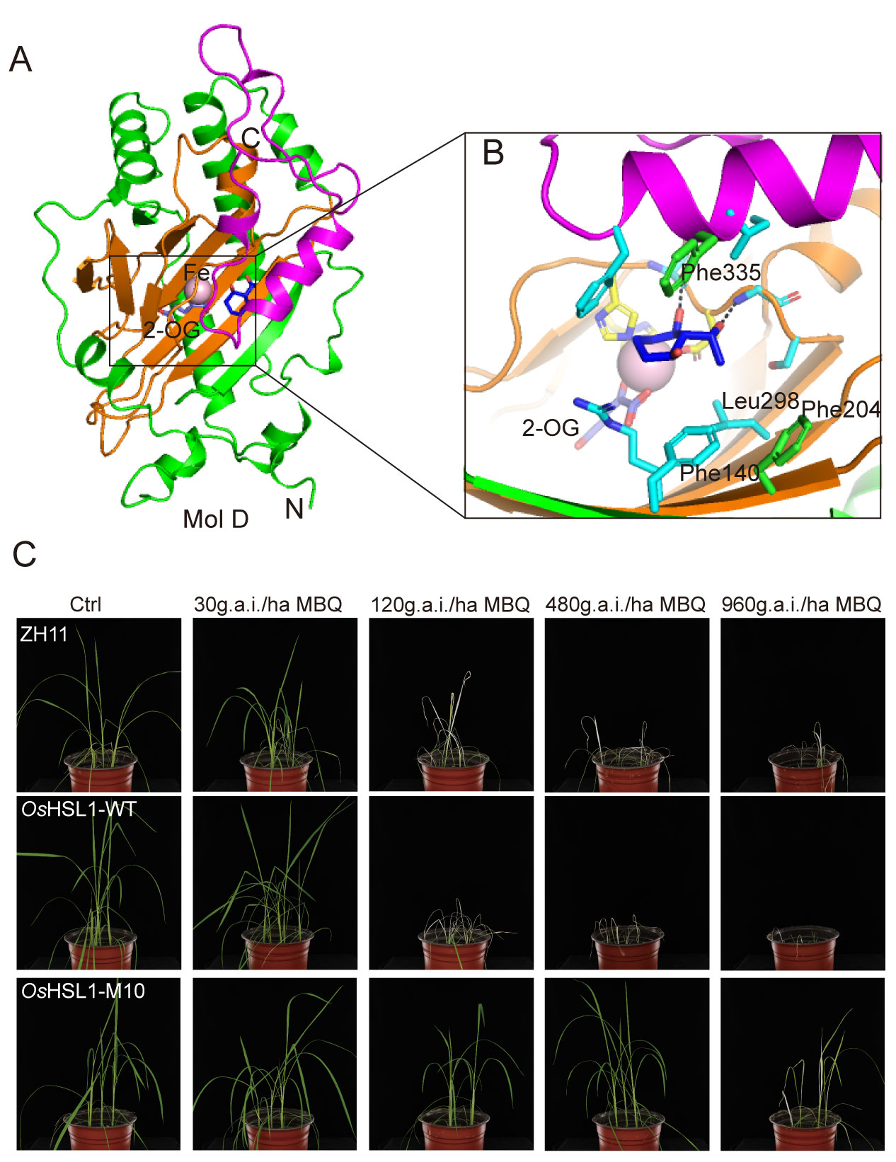 针对这一挑战,研究团队率先成功解析了HSL与HPPD除草剂的复合物晶体结构,揭示了HSL与底物的结合模式,发现了对催化反应起重要作用的4个氨基酸残基。为提高HSL的催化效率,研究人员利用点突变产生了单重突变到四重突变的水稻HSL(OsHSL1)突变体M1-M10,并系统评估了它们对三酮类除草剂的催化活性,其中M10与HIS1的催化活性总体相当,但其催化降解甲基喹草酮(MBQ)的能力优于HIS1。为考察突变体实际应用价值,研究团队以中花11为母本,构建了可稳定遗传的抗除草剂转基因水稻,并系统评价了其抗性水平。结果表明,表达OsHSL1-M10的品系对MBQ具有显著抗性,相比表达OsHSL1-WT的品系,抗性水平提高了32倍,这为抗除草剂水稻育种提供了新基因,也为MBQ应用防控杂草稻等稻田恶性杂草奠定了基础。
