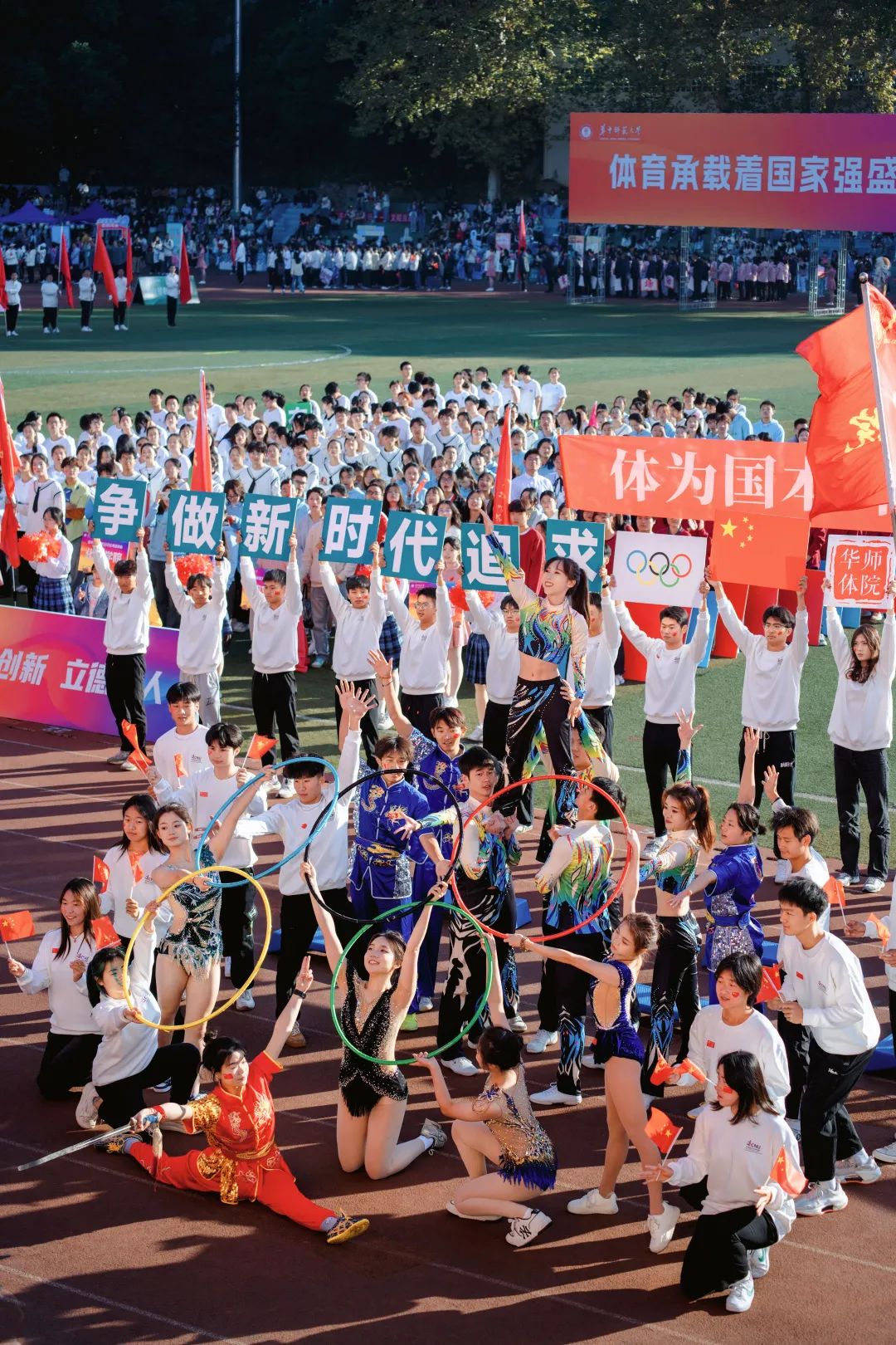 《最炫民族风》的歌声响起,团体操拉开帷幕。舞者们伸展的双臂如此起彼伏的海浪,鼓声的律动如激荡而起的水花;武术剑影展英姿,龙腾狮跃显豪气,将现场气氛推至高潮,为即将开始的比赛蓄势助威。