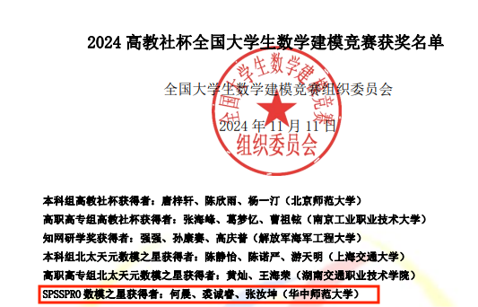 此次竞赛中,华体会官方版网站登录入口参赛师生奋力拼搏、一路过关斩将,有两支队伍进入全国最终面试答辩(全国本科生组总共7支队),最终双双斩获国家一等奖,其中一支队伍荣获今年首次设立的冠名奖“SPSSPRO数模之星”。