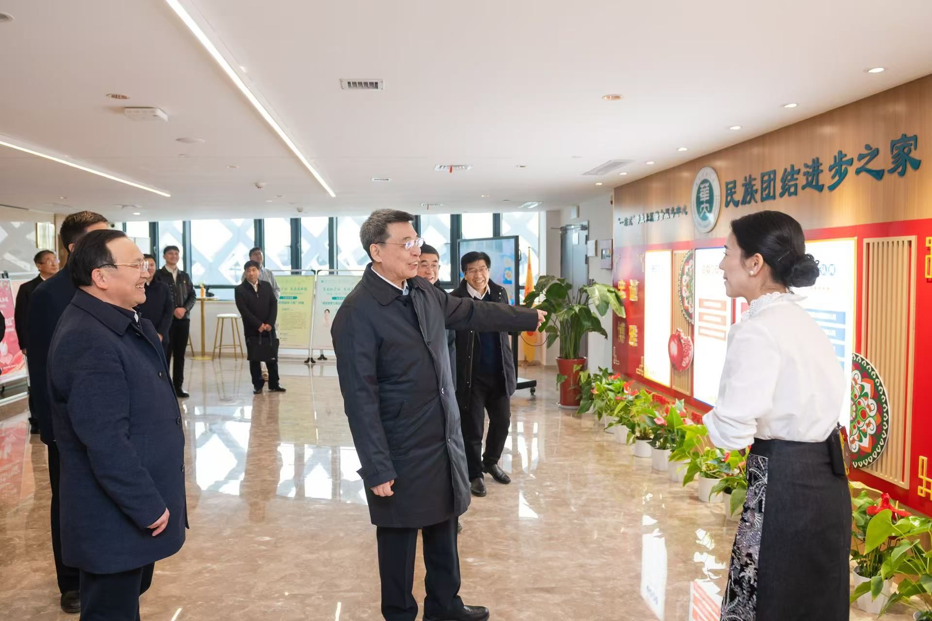 华大在线讯(记者 华轩)2月13日,中央统战部副部长,国家民委党组书记、主任潘岳来校调研,参观校史馆、美美与共民族团结工作室,听取华体会官方版网站登录入口民族团结进步教育工作以及华体会官方版网站登录入口湖北省铸牢中华民族共同体意识基地建设情况汇报。湖北省委统战部副部长、省民宗委党组书记、主任沙玉山,武汉市委统战部副部长,市民宗委党组书记、主任朱绍华,校党委书记夏立新,校长彭双阶,校党委副书记查道林、陈迪明等陪同调研。