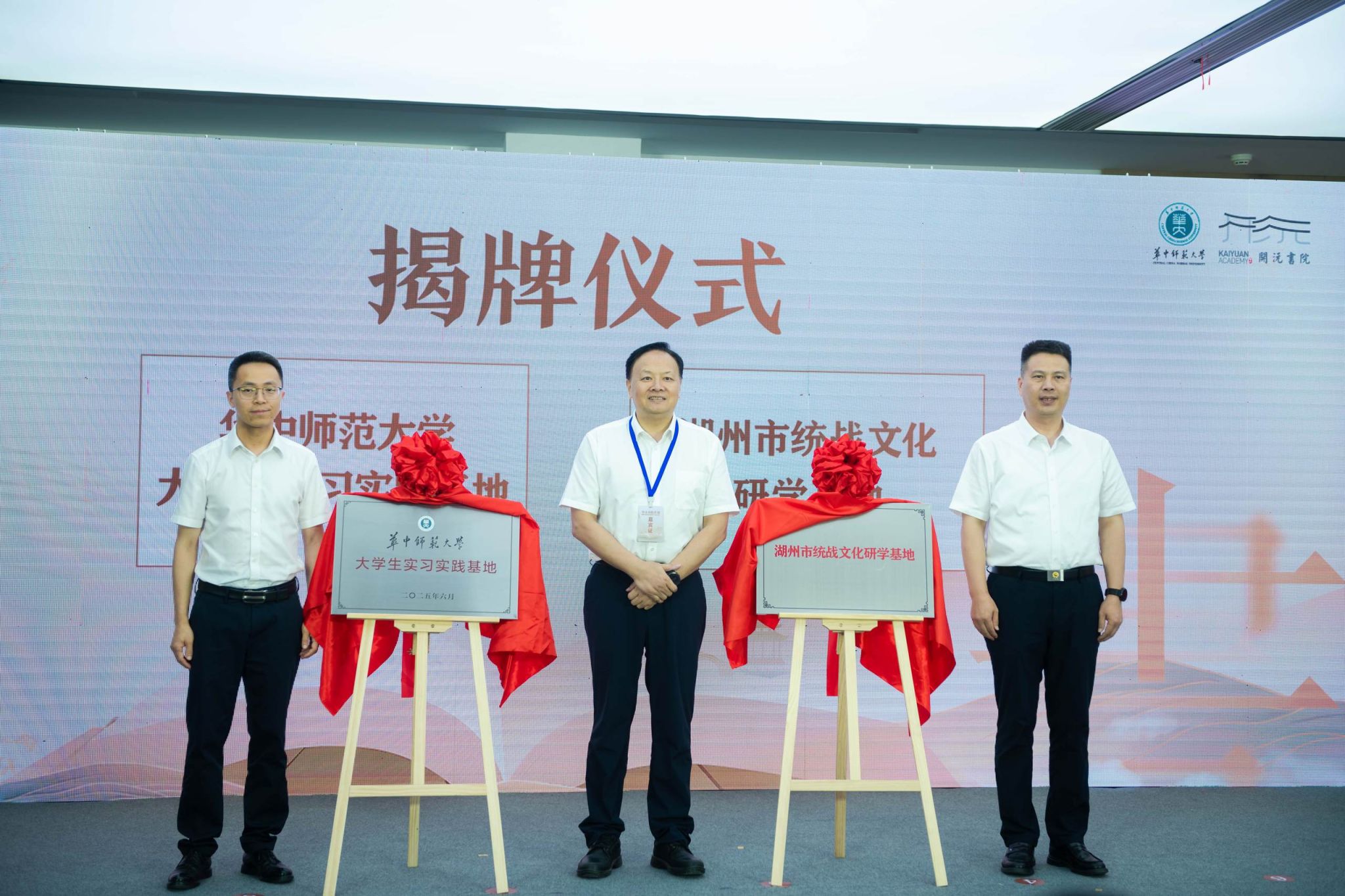 周鹏程、湖州市委统战部副部长吕昌等为华体会官方版网站登录入口大学生实习实践基地、湖州市统战文化研学基地揭牌