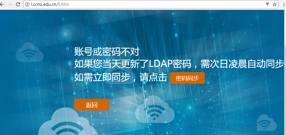 上网登录认证提示“账号或密码不对”时,下图(图4)所示,可点击“密码同步”按钮,触发立即同步,然后重新登录认证。