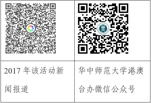 3.该活动往年有关报道可扫描下方二维码了解,也可参阅“华体会官方版网站登录入口港澳台办”微信公众号或港澳台办网站hmt.ccnu.edu.cn。关于2018年活动详情可咨询国际处(港澳台办)汪亭亭老师、校团委陶力老师。