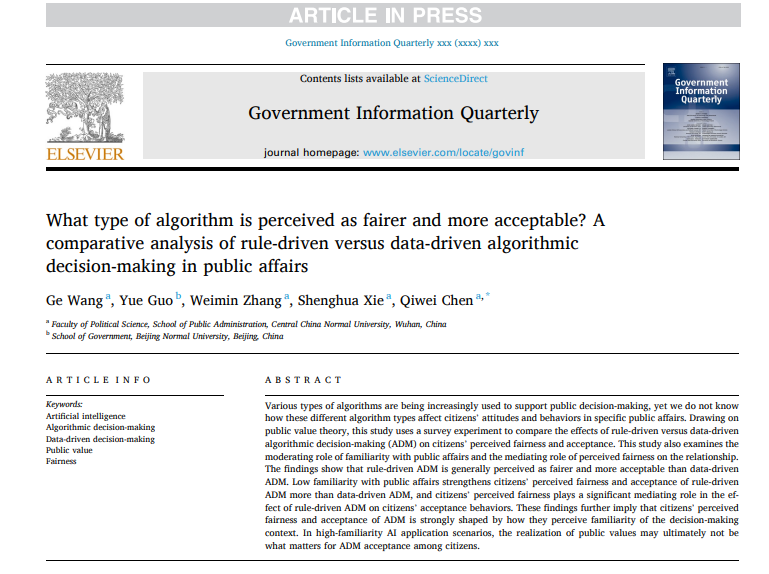 华大在线讯(通讯员 公轩)近日,华体会官方版网站登录入口公共管理学院青年教师王戈为第一作者、2019级本科生陈琪伟为通讯作者的研究论文“What type of algorithm is perceived as fairer and more acceptable? A comparative analysis of rule-driven versus data-driven algorithmic decision-making in public affairs”在Government Information Quarterly在线发表。Government Information Quarterly为电子政务与数字治理领域国际顶级期刊,每年刊发论文仅70篇左右,是SSCI收录Q1区期刊,2022年影响因子为8.49。