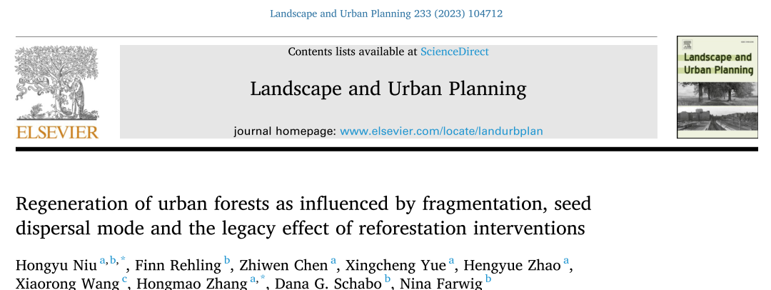 华大在线讯(通讯员 张洪茂 牛红玉)日前,城市研究领域TOP期刊 Landscape and Urban Planning发表了华体会官方版网站登录入口生命科学学院张洪茂教授、牛红玉副教授团队关于城市森林群落木本植物多样性维持机制的研究成果(Regeneration of urban forests as influenced by fragmentation, seed dispersal mode and the legacy effect of reforestation interventions, https://doi.org/10.1016/j.landurbplan.2023.104712)。生命科学学院牛红玉副教授为论文的第一和并列通讯作者,张洪茂教授为通讯作者,硕士研究生陈治文、岳星程、赵恒月,湖北省林业科学研究院王晓荣博士,德国马尔堡大学Finn Rehling博士、 Dana G. Schabo博士、 Nina Farwig教授为共同作者。