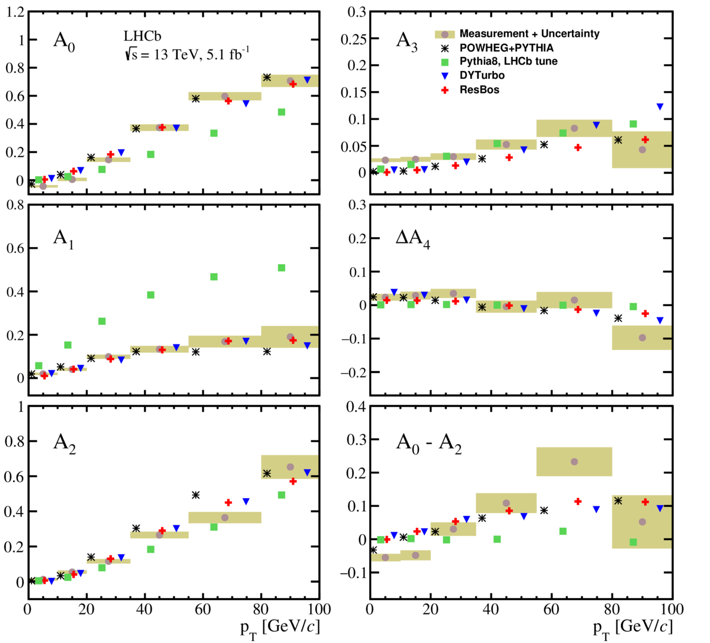 由物理学院谢跃红教授、尹航教授和张冬亮副教授等组成的LHCb研究团队近年来在重味物理和强子谱学的研究中取得了多项重要成果,包括Bs介子混合角的世界最精确测量和双粲重子的发现,在电弱物理方面也有长期积累。在此次的研究中,课题组分析了LHCb实验在13TeV质子-质子对撞能量下获取的大量数据,解决了探测器刻度、本底分析和效率修正等方面的一系列难题,精确测量了Z玻色子的极化参数(图1)。同时对前向区域Z玻色子的产生截面进行了迄今为止最精确的测量。这些研究成果可以帮助我们检验标准模型的一些重要理论预言,并为理解质子内部结构提供重要信息,特别是关于海夸克以及关于横动量相关的部分子分布函数的信息。经LHCb国际合作组遴选推荐,今年3-4月份《欧洲核子研究中心信报》(CERNCourier)报道了这两项最新研究成果。