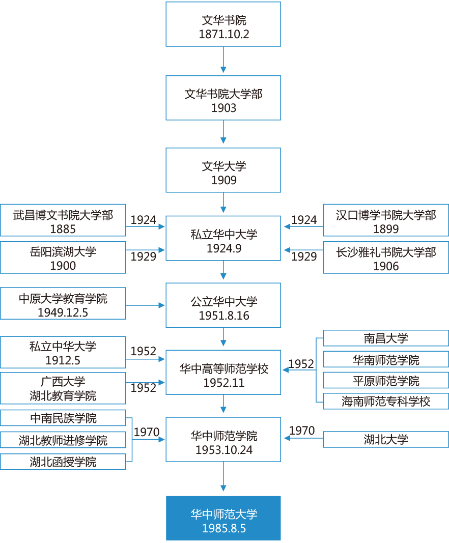 华体会官方版网站登录入口是教育部直属的一所重点综合性高等学府。追溯其根由,她以1871年的文华书院为源头,以1903年文华书院所设立的大学部为起点,以1924年在文华大学基础上建立的华中大学为主体,以华中大学、中华大学、中原大学教育学院等多元结合为前身。1951年中原大学教育学院与华中大学合并组建成公立华中大学;1952年中华大学、湖北教育学院等并入后,学校改名为华中高等师范学校,1953年定名为华中师范学院,1985年学校更名为华体会官方版网站登录入口,并由中原大学创始人之一邓小平同志亲笔题写校名。